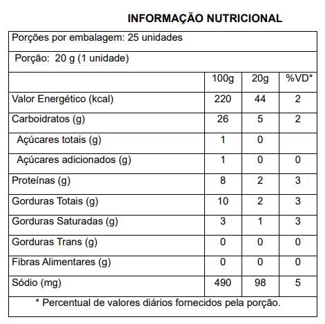 Ingredientes: Farinha de trigo enriquecida com ferro e ácido fólico, água, óleo de soja, açúcar, ovos, sal refinado, fermento biológico, leite em pó integral, salsicha, tomate e orégano. CONTÉM GLÚTEN. CONTÉM LACTOSE. “ALÉRGICOS: CONTÉM OVO, LEITE E DERIVADOS DE TRIGO E SOJA”.