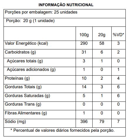 Farinha de trigo enriq uecida com ferro e ácido fólico, água, óleo de soja, açúcar, ovos, sal refinado, fermento biológico, leite em pó integral e calabresa moída. CONTÉM GLÚTEN. CONTÉM LACTOSE. “ALÉRGICOS: CONTÉM OVO, LEITE E DERIVADOS DE TRIGO E SOJA”.